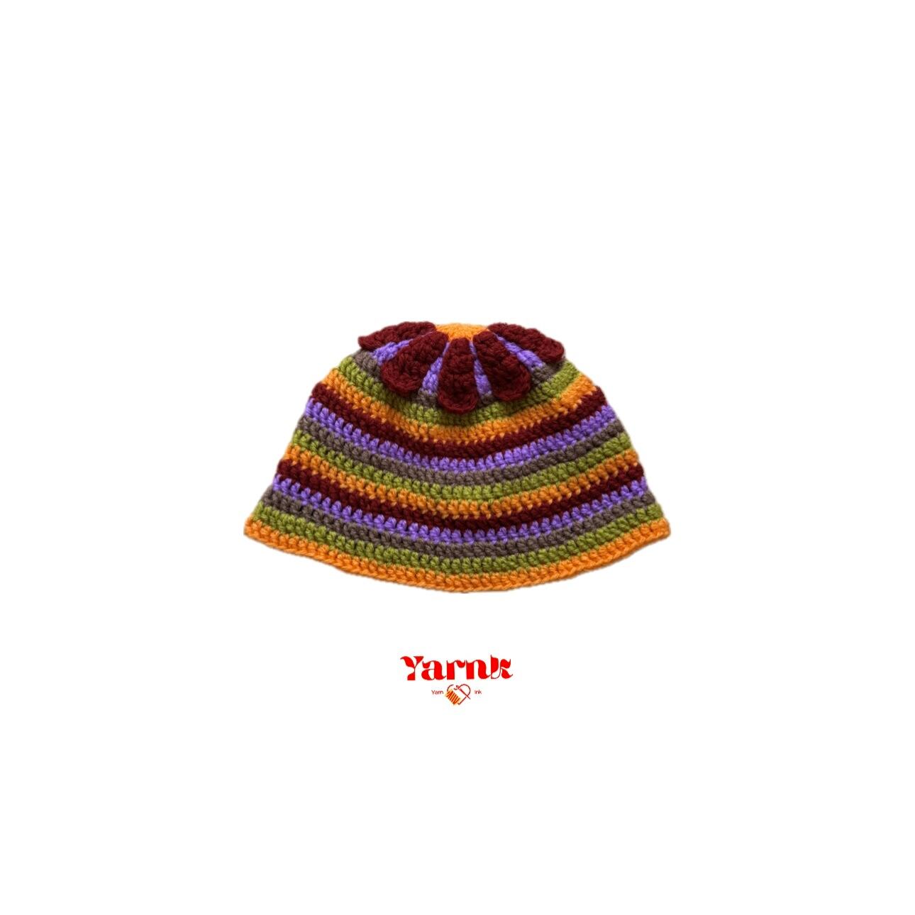 てっぺんに咲いたフラワーモチーフがメインのバケットハット。
