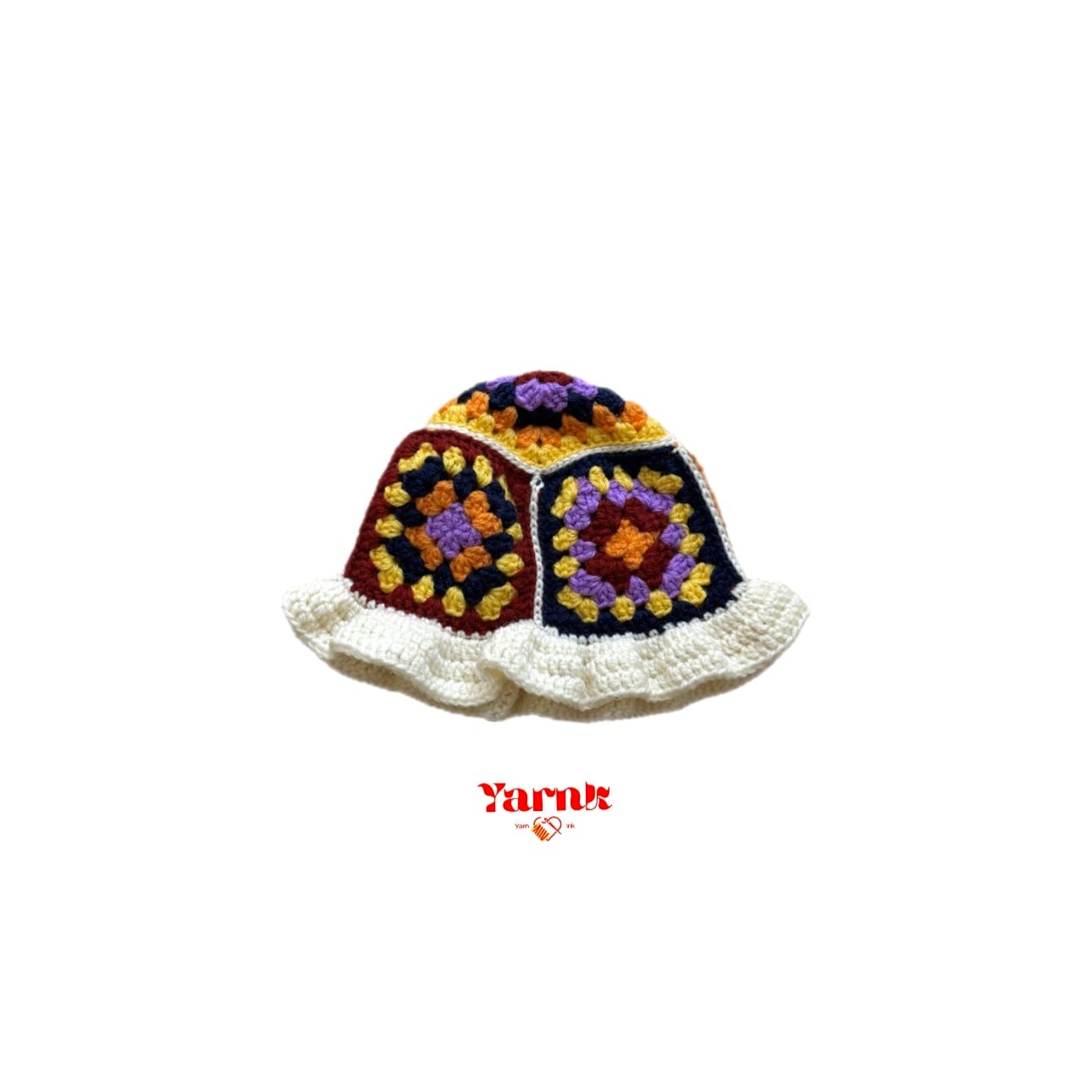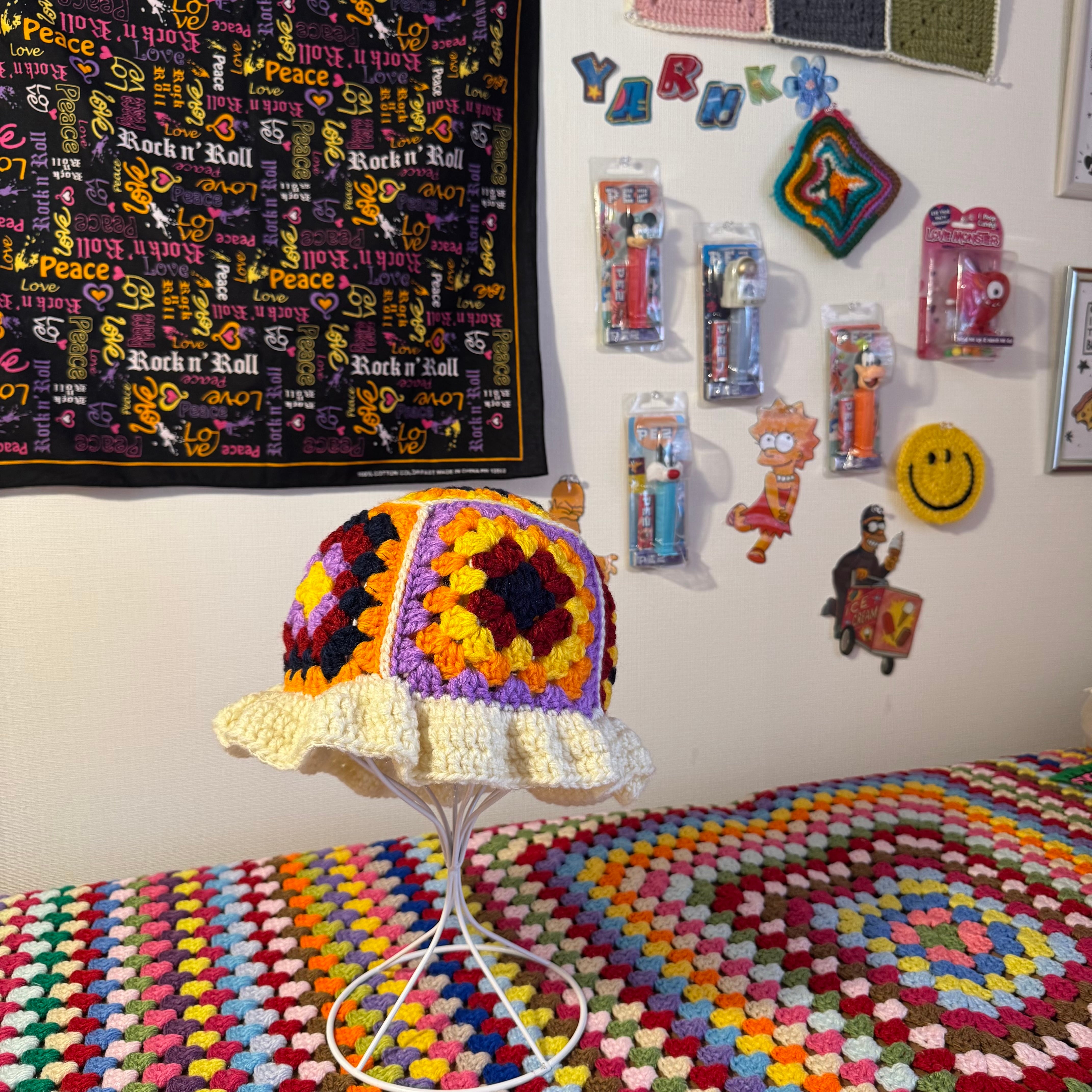 被るだけでテンションの上がるカラフルなグラニースクエアをぐるりとちりばめたバケットハット。