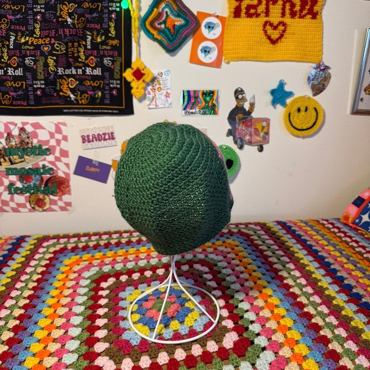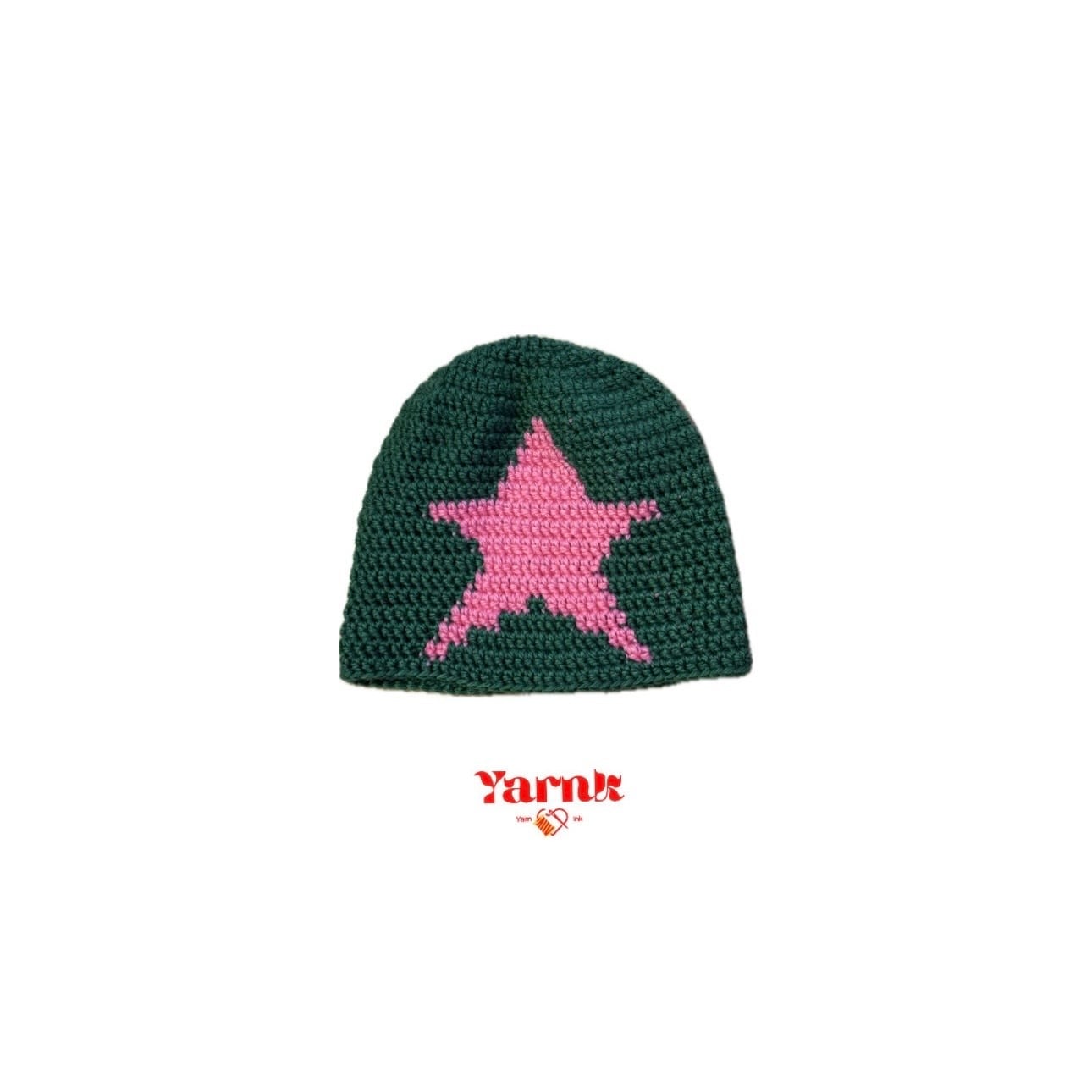 グリーンベースに、ピンクの星をメインに編み込んだ1点☆