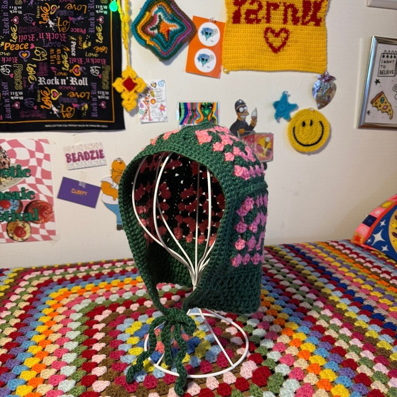 肌馴染みのいいグリーン×ピンクで編み込んだボンネット!